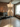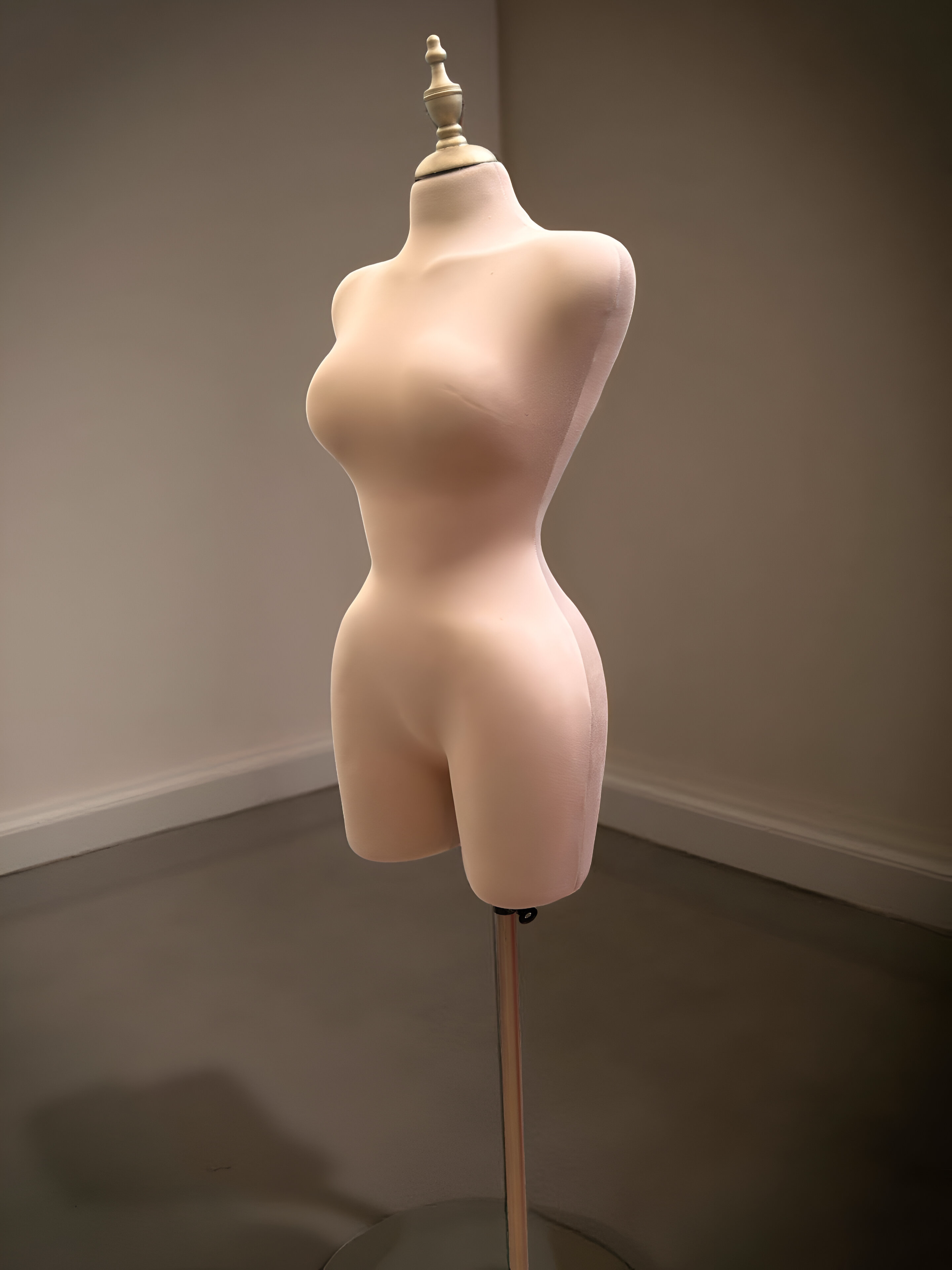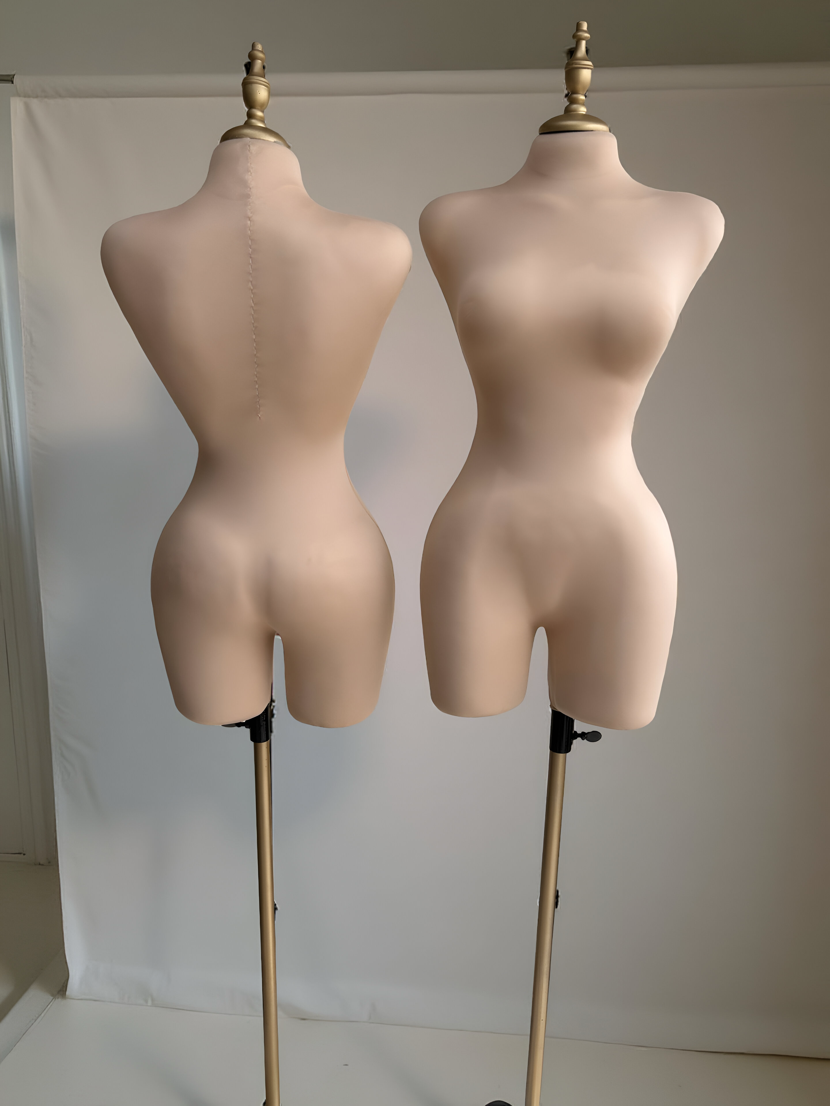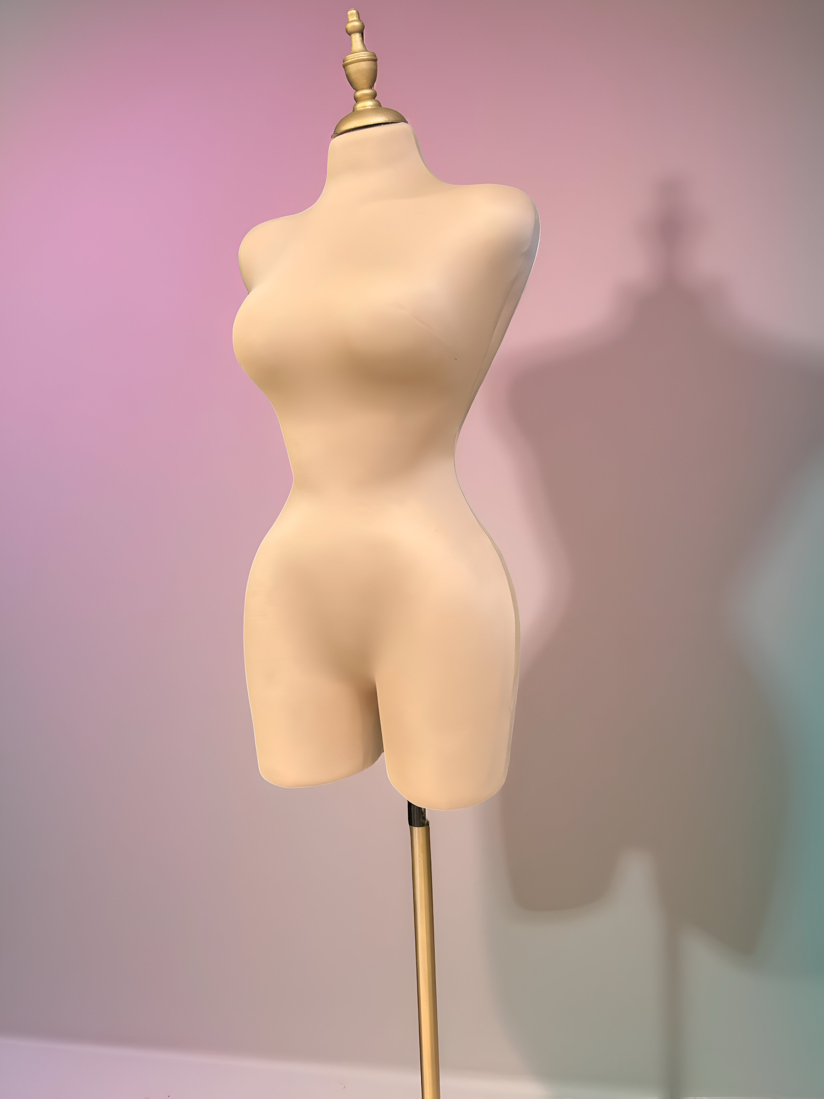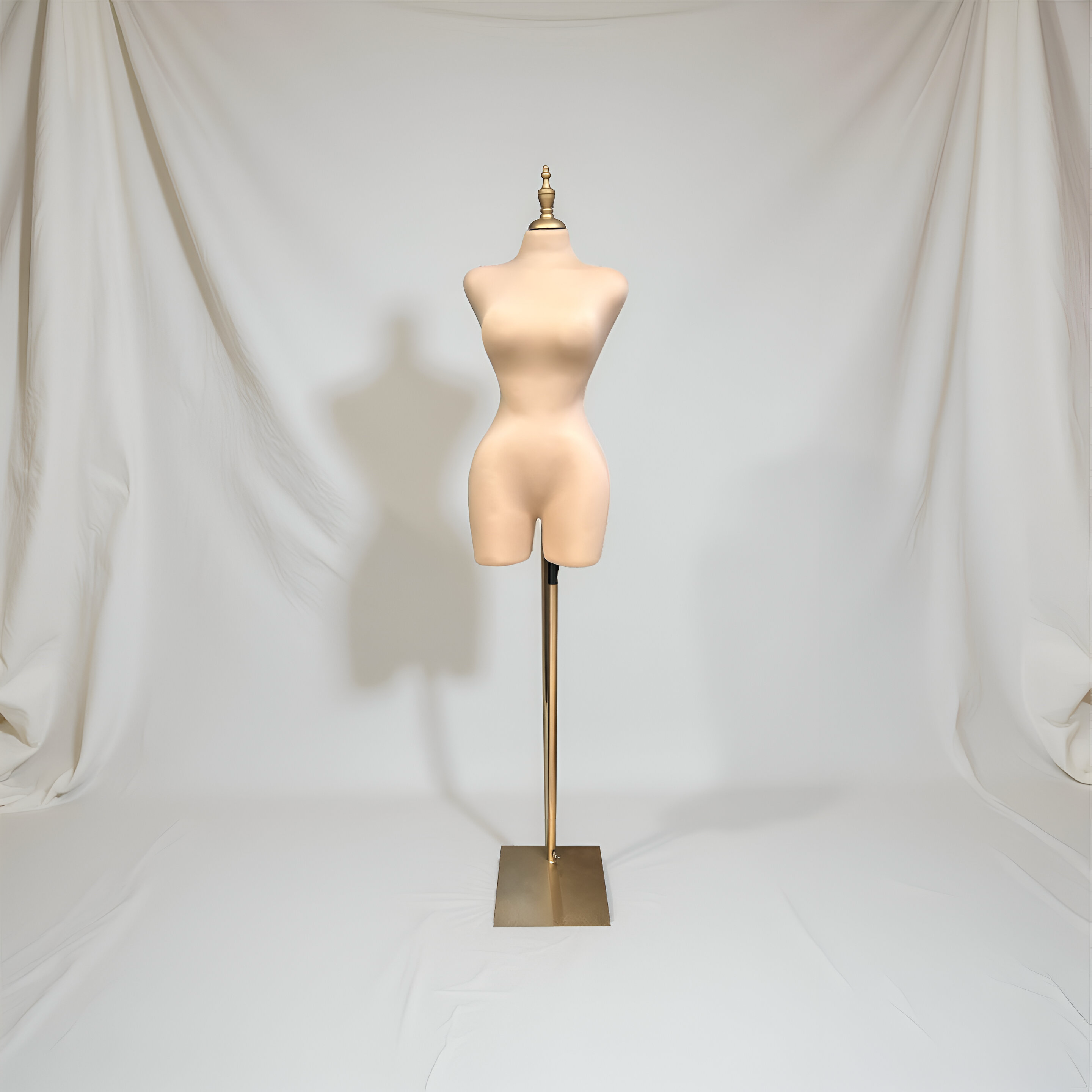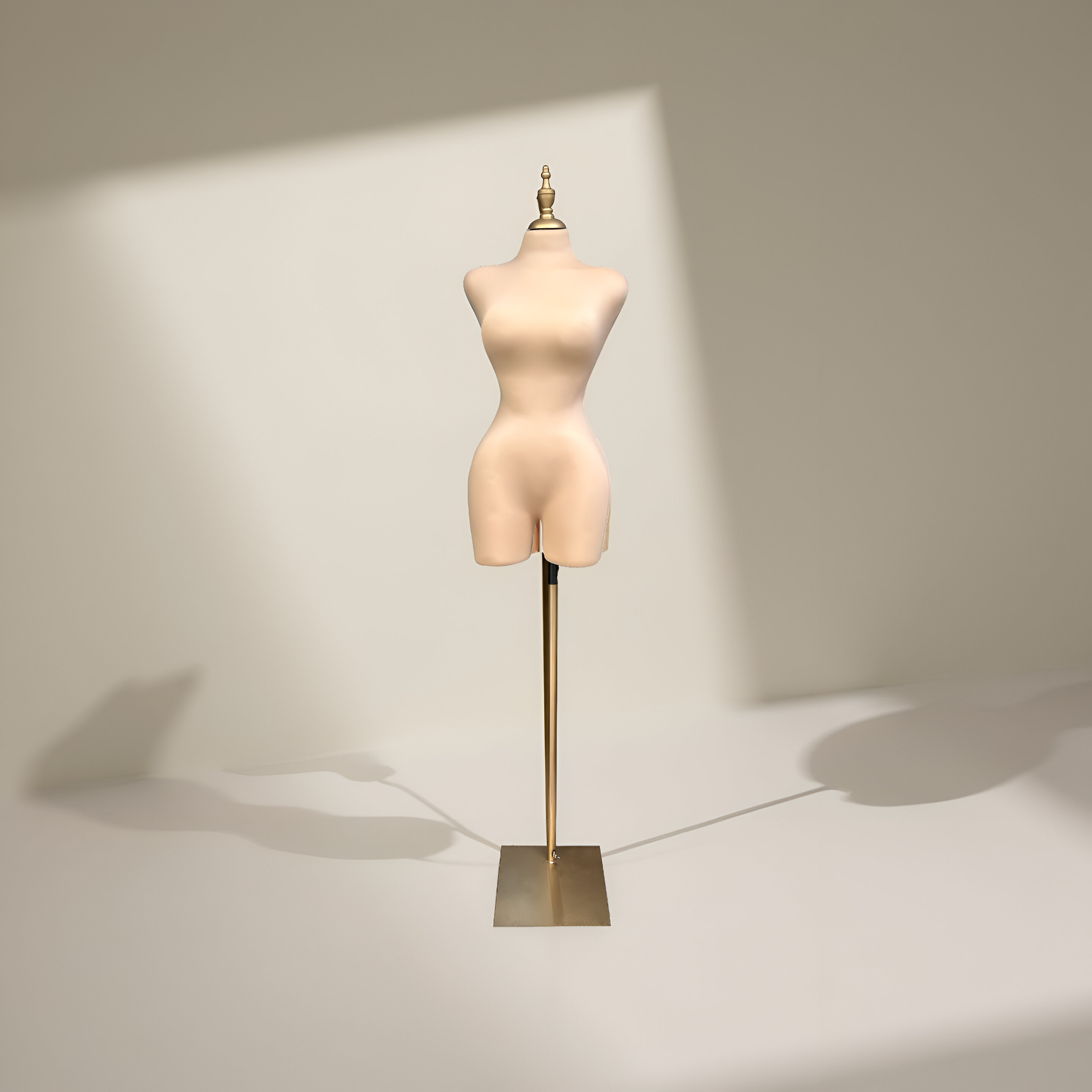 Maniquí forrado en tela beige con pivote base y tubo dorado