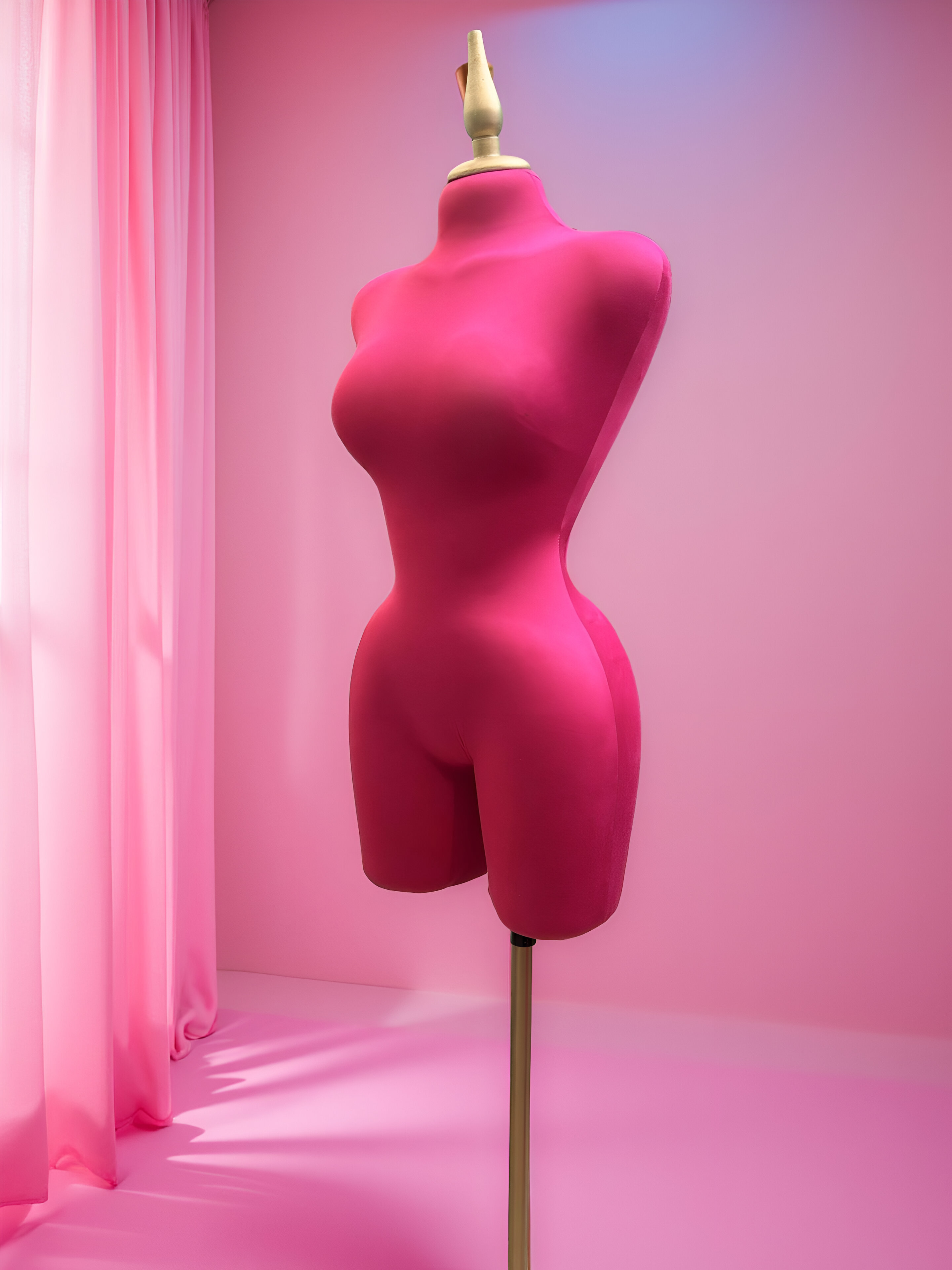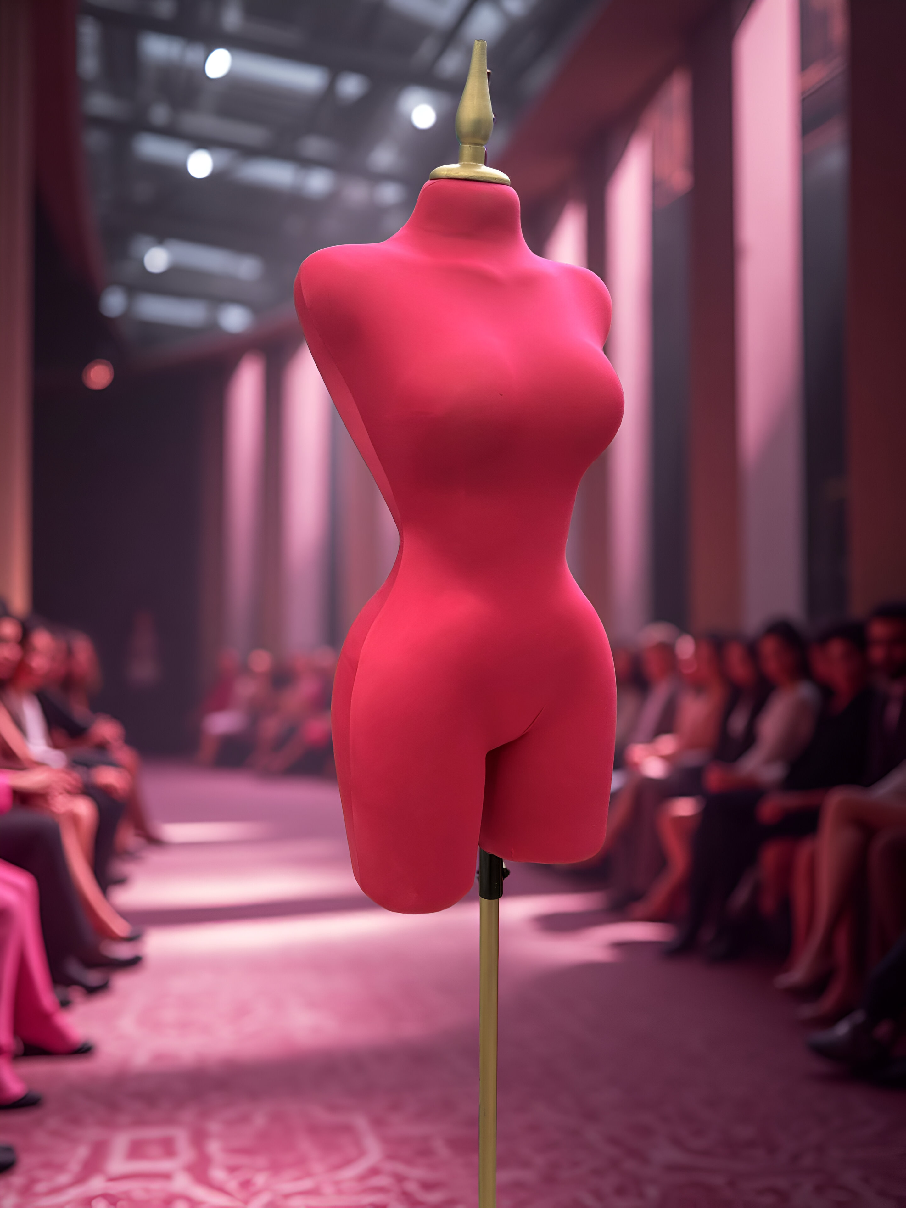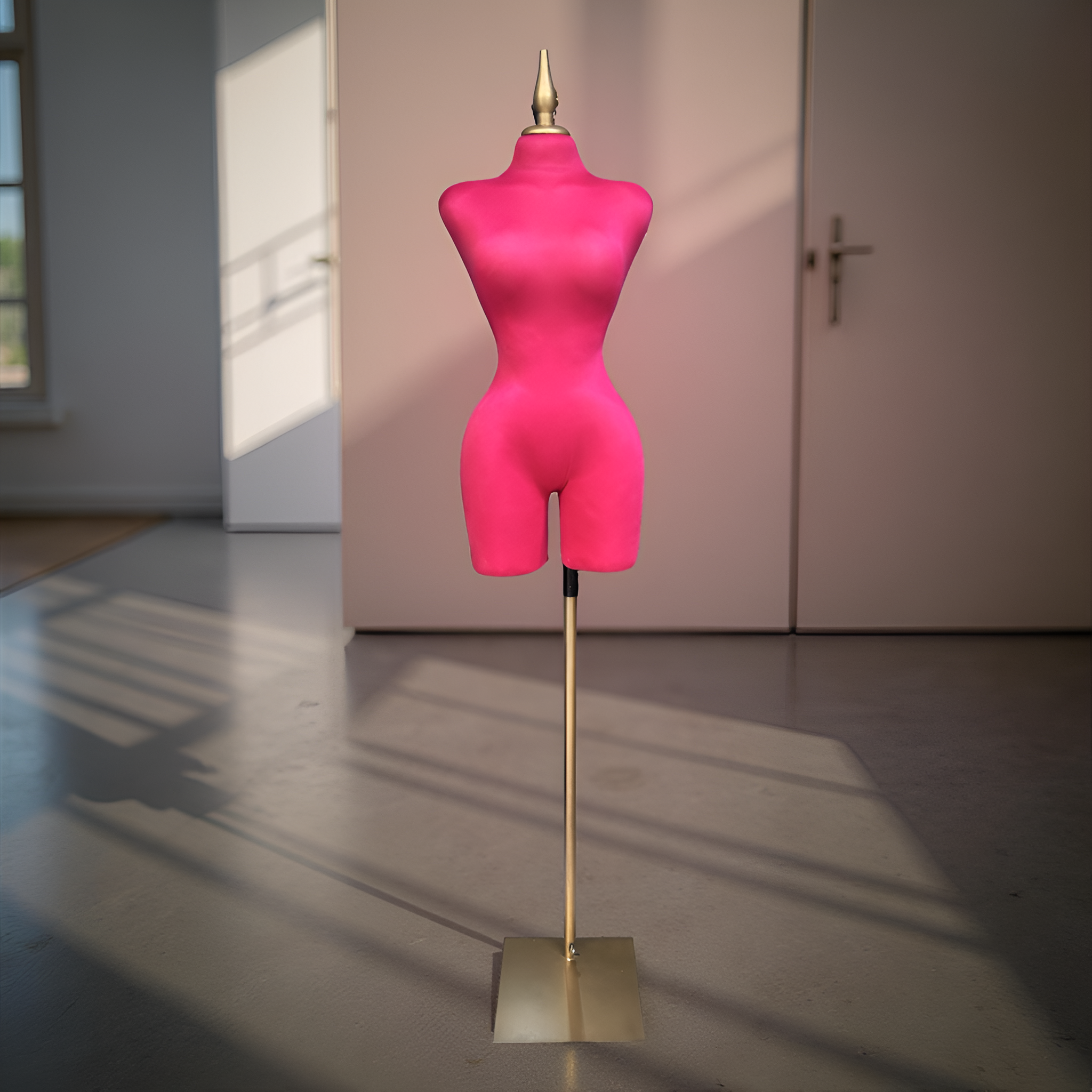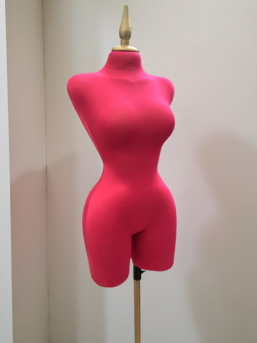 Maniquí forrado en tela fiusha con pico y base dorada
