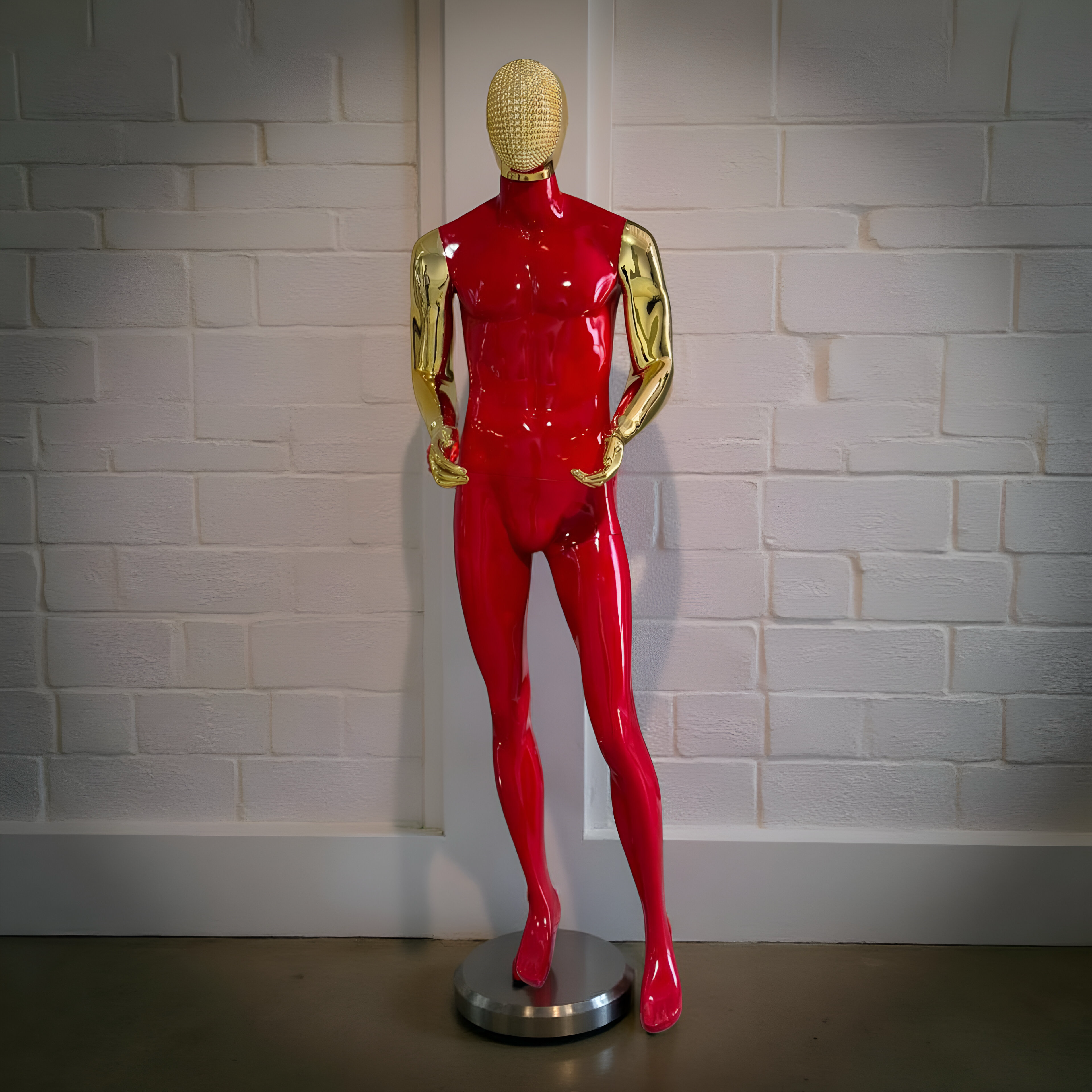 este maniquí está ideal para para tiendas de ropa de caballero, todo le queda perfecto, musculoso con detalles cromados que harán que lo que le pongas se le vea increíble.