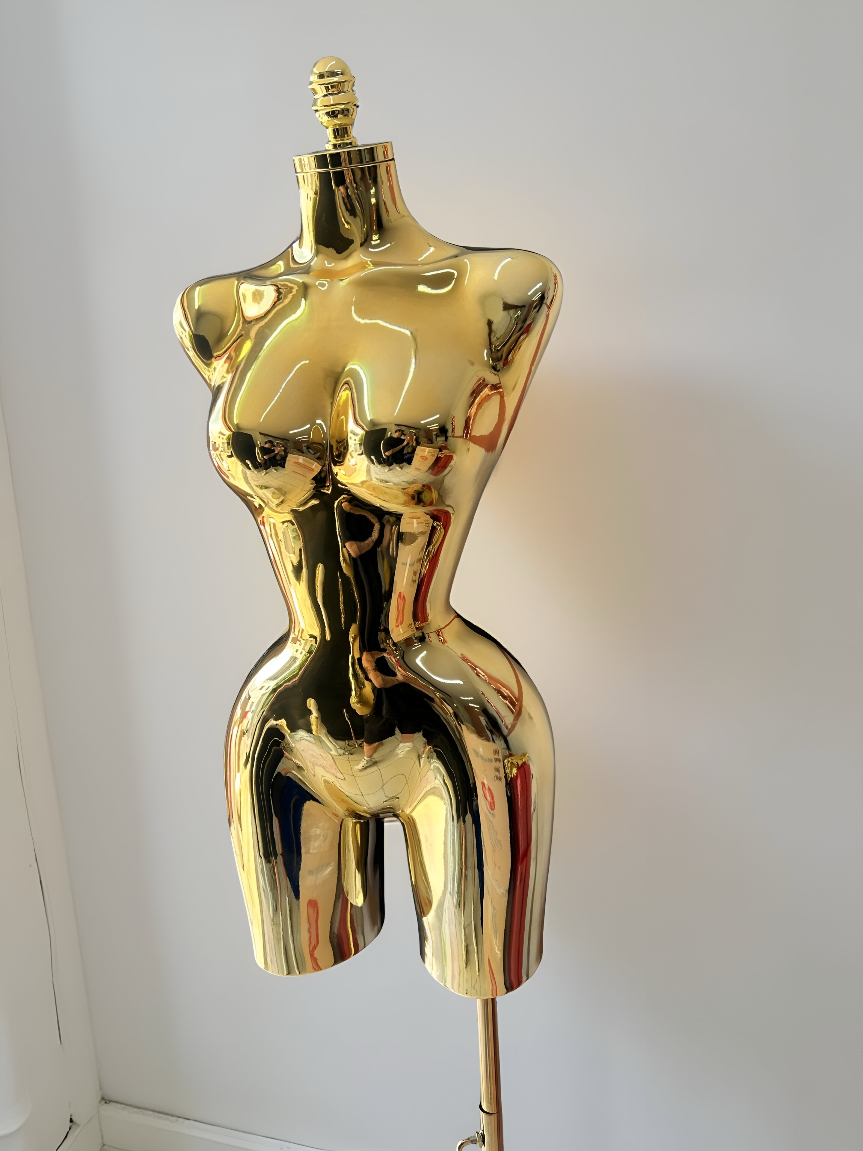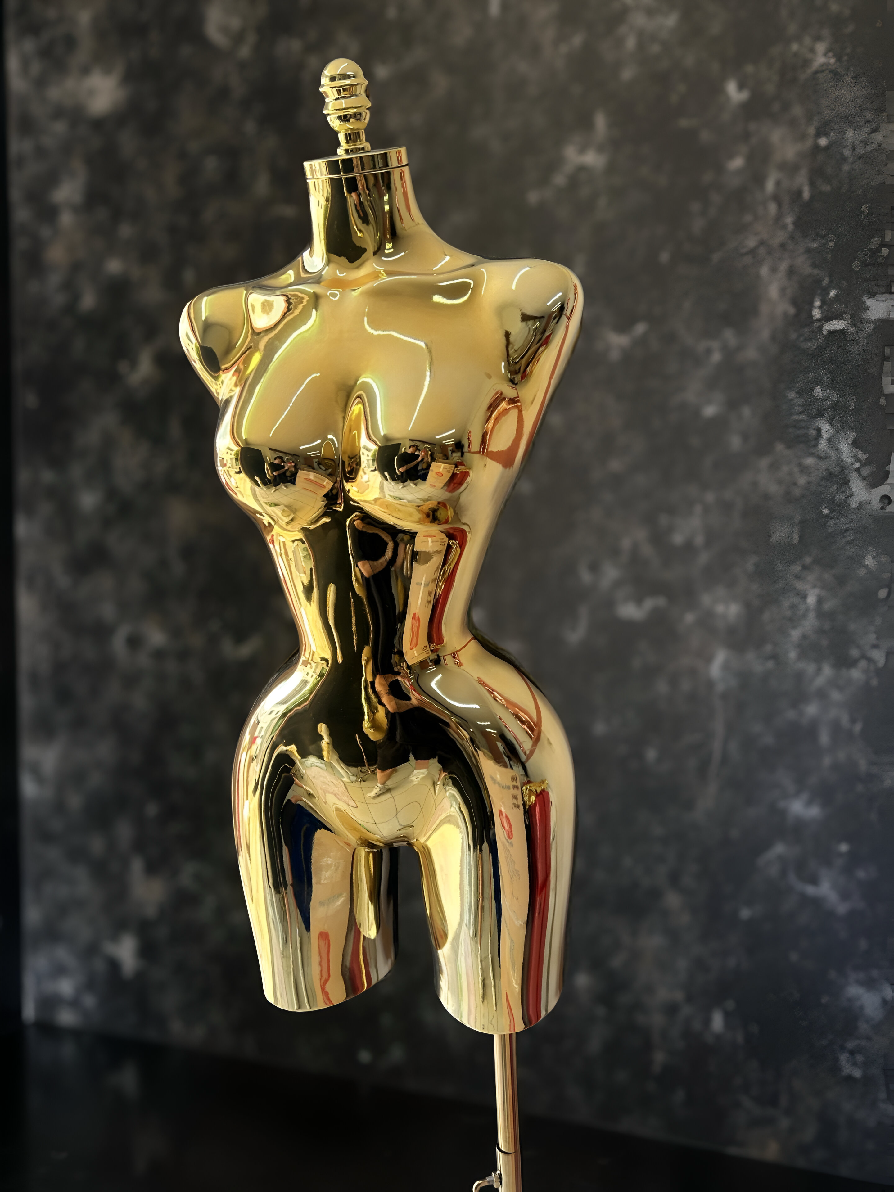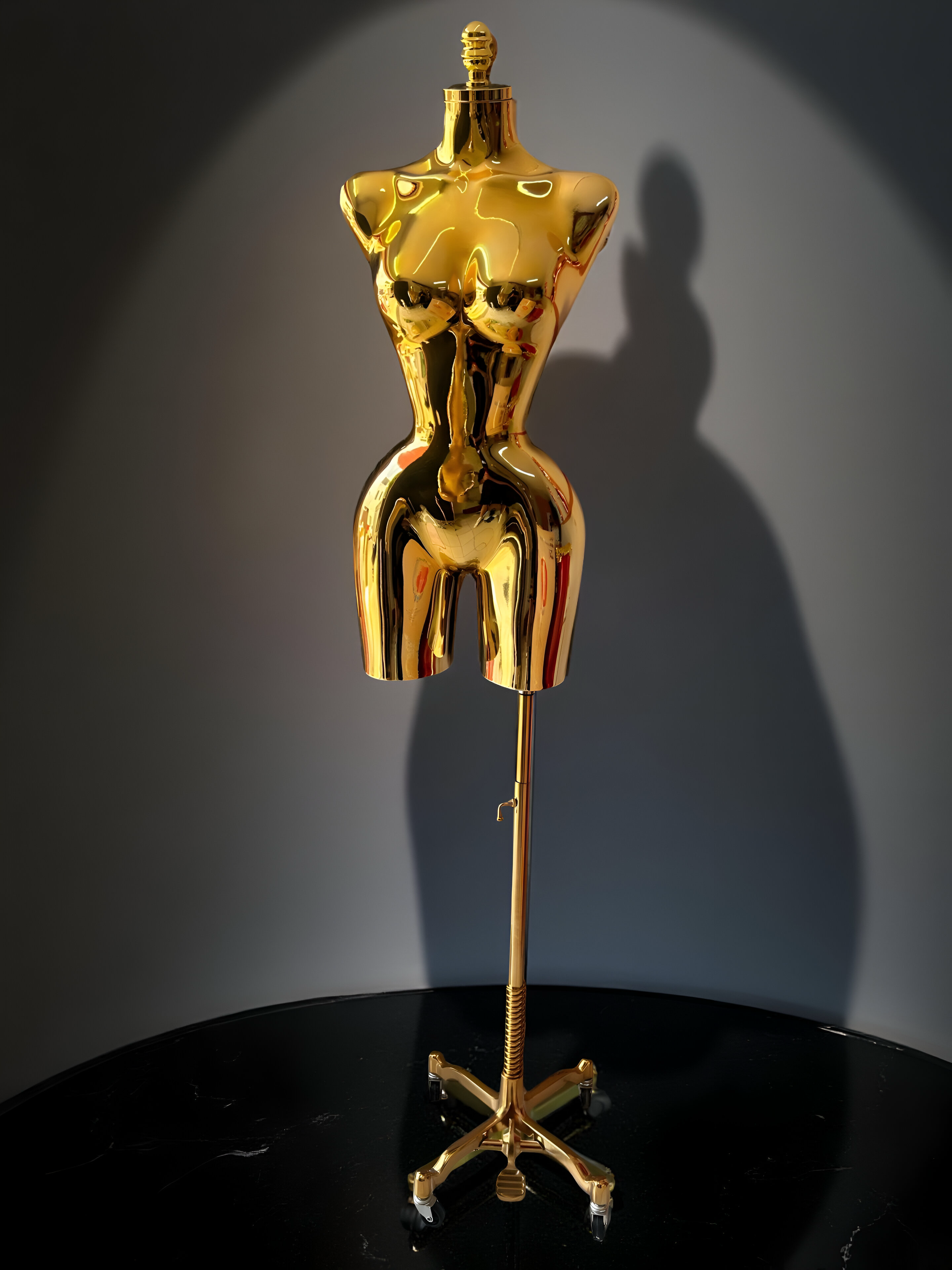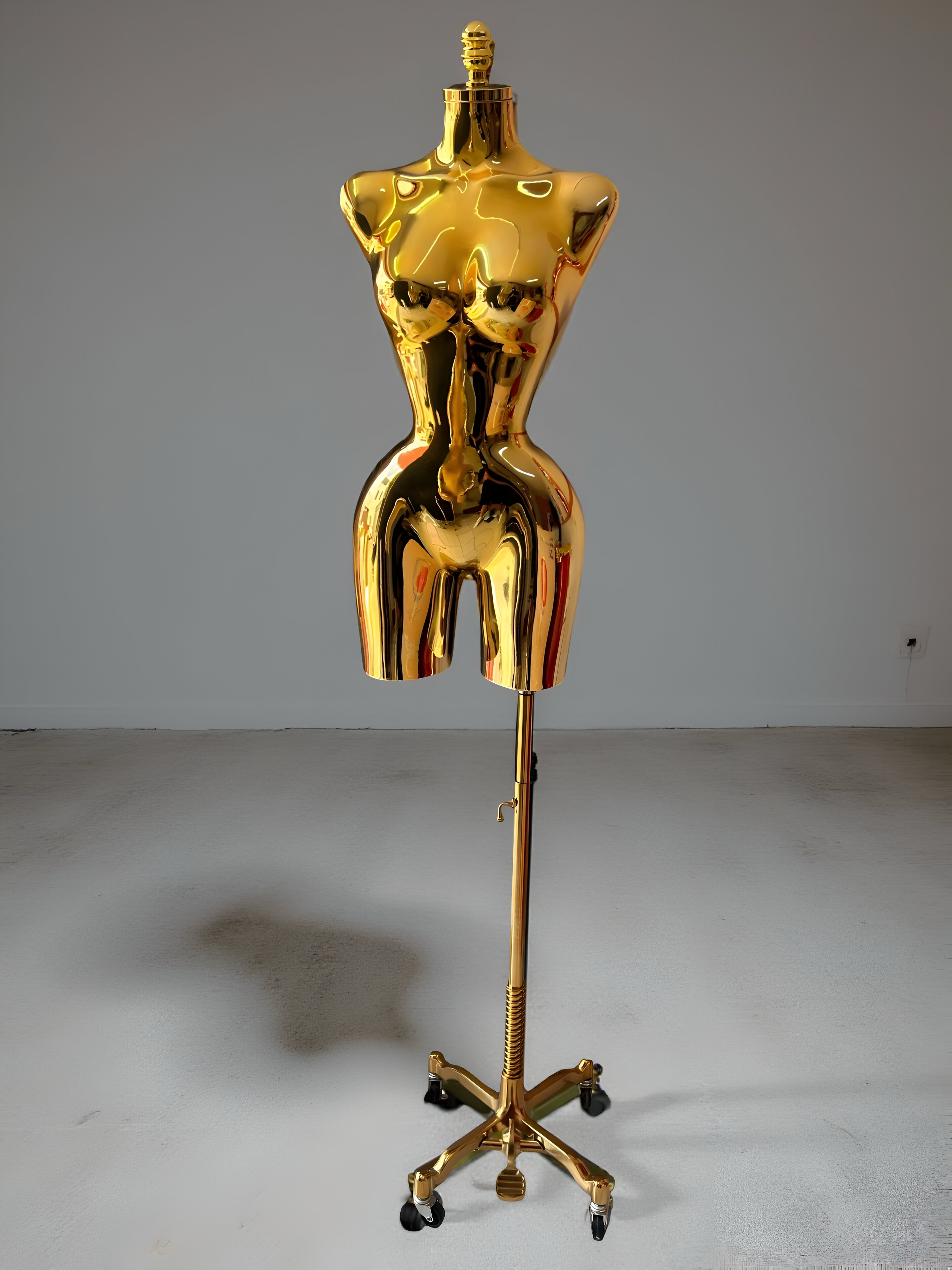 Maniqui de importación de plástico completamente “cromado” con pivote, acinturado, incluye base de llantas.
